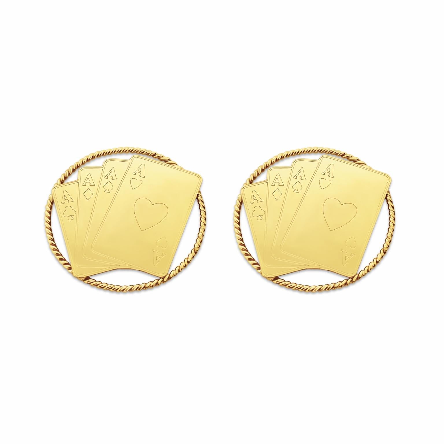 Affirmez votre style avec ces boucles d’oreilles uniques inspirées du jeu de cartes. Finement travaillées, elles représentent une main de quatre As, symbole de chance, de pouvoir et d’assurance. Leur finition brillante et leur design raffiné en font une pièce forte, à la fois chic et audacieuse.