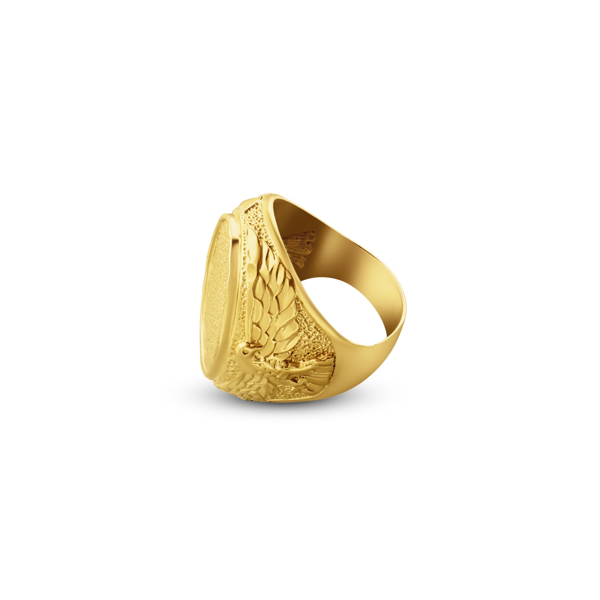 Une chevalière imposante en or 18 carats, ornée d’un aigle finement sculpté sur les côtés. Le plateau ovale présente une texture martelée qui apporte du relief et un style puissant. Une pièce forte, détaillée et masculine, idéale pour ceux qui recherchent un bijou avec du caractère.